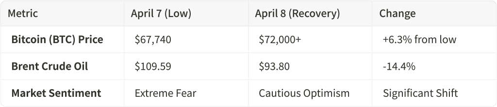 While oil was crashing, Bitcoin was doing something entirely different: it was recovering. After the initial dip to $67,740 on the "doom and gloom" news, BTC did not languish. Instead, it staged a remarkable comeback as the details of the ceasefire emerged. By the time oil had hit its $94 low, Bitcoin had reclaimed the $72,000 level, closing the day on April 7 at $71,940 and maintaining that strength through April 8.
